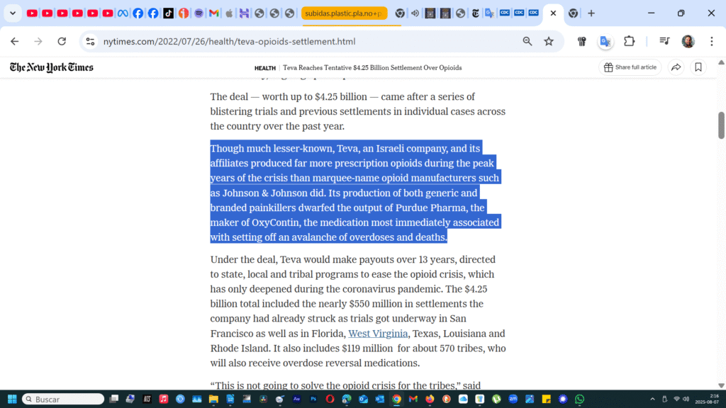 SOURCE OF THE DATA OF OPIOIDS SALES OF TEVA PHARMACEUTICALS ISRAEL AND JOHNSON & JOHNSON (KNOWN AS J&J IN THE STOCK MARKET. YOU CAN PROFIT FROM THEIR MARKETING TECHNIQUES) SOLD MORE OPIOIDS THAN PURDUE PHARMA (SACKLER FAMILY BUssINESs only owners SO THEY WEREN´T ON THE STOCK MARKET OF WALL STREET, SO THEY WEREN´T PROTECTED BY WALL STREET, SO THAT´S WHY THEY ARE FAMOUS INSTEAD OF J&J AND TEVA WHICH THEY STILL ARE OPERATING IN THE MARKETS): https://www.nytimes.com/2022/07/26/health/teva-opioids-settlement.html Though much lesser-known, Teva, an Israeli company, and its affiliates produced far more prescription opioids during the peak years of the crisis than marquee-name opioid manufacturers such as Johnson & Johnson did. Its production of both generic and branded painkillers dwarfed the output of Purdue Pharma, the maker of OxyContin, the medication most immediately associated with setting off an avalanche of overdoses and deaths.